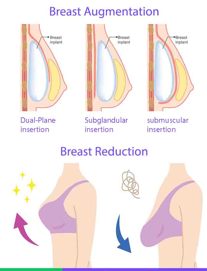Breast reduction surgery, also known as reduction mammoplasty, is the opposite of breast augmentation. Breast reduction surgery reduces the size of the breasts by removing fat, tissue, and skin. It's often performed on patients with large breasts that cause discomfort or make it difficult to wear certain clothing