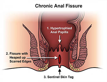 An anal fissure is a small tear in the tissue that lines the anus. Fissures can occur when the anal mucosa stretches beyond its normal capacity, which can happen when stools are hard due to constipation..