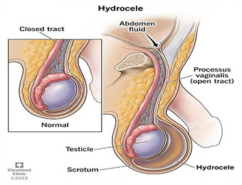 A hydrocele is a sac of fluid around the testicle. It occurs when a tube that carries the testicles from the abdomen to the scrotum doesn't close after the testicle passes through. Fluid from the abdomen then drains through the open tube and gets trapped in the scrotum, causing it to swell..